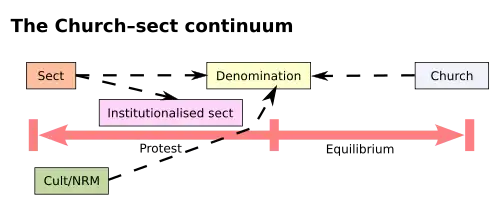 Later sociological formulations built on such characteristics, placing an additional emphasis on cults as deviant religious groups, "deriving their inspiration from outside of the predominant religious culture."[26] This is often thought to lead to a high degree of tension between the group and the more mainstream culture surrounding it, a characteristic shared with religious sects.[27] According to this sociological terminology, sects are products of religious schism and therefore maintain a continuity with traditional beliefs and practices, whereas cults arise spontaneously around novel beliefs and practices.[28]