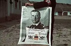 Starting in the 1920s, during the early years of the Nazi Party, Nazi propaganda began to depict the Nazi leader Adolf Hitler as a demagogue figure who was the almighty defender and savior of Germany. After the end of World War I (1918) and the Treaty of Versailles (1919), the German people experienced turmoil under the Weimar Republic, and, according to Nazi propaganda, only Hitler could save them and restore Germany's greatness, which in turn gave rise to the "Führer-cult".[110] During the five election campaigns in 1932, the Nazi newspaper Völkischer Beobachter portrayed Hitler as a man who had a mass movement united behind him, a man with one mission — to solely save Germany as the 'Leader of the coming Germany'.[111] The Night of the Long Knives in 1934 – after which Hitler referred to himself as being single-handedly "responsible for the fate of the German people" – also helped to reinforce the myth that Hitler was the sole protector of the Volksgemeinschaft, the ethnic community of the German people.[112]