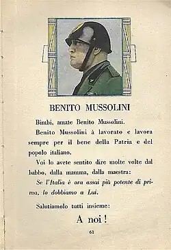Benito Mussolini was portrayed as the embodiment of Italian Fascism and as a result, he was keen to be seen as such.[58] Mussolini was styled by other Italian fascists as Il Duce ("The Leader"). Since Mussolini was represented as an almost omniscient leader, a common saying in Italy during Mussolini's rule was "The Duce is always right" (Italian: Il Duce ha sempre ragione).[59] Mussolini became a unifying force in Italy in order for ordinary Italians to put their difference to one side with local officials. The personality cult surrounding Mussolini became a way for him to justify his personal rule and it acted as a way to enable social and political integration.