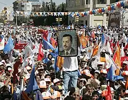 As a sign of his consolidation of power as Iraq's dictator, Saddam Hussein's personality cult pervaded Iraqi society. He had thousands of portraits, posters, statues and murals erected in his honor all over Iraq.[104] His face could be seen on the sides of office buildings, schools and classrooms, airports, and shops, as well as on all denominations of Iraqi currency (the dinar). Saddam's personality cult reflected his efforts to appeal to the various elements in Iraqi society. This was seen in his variety of apparel: he appeared in the costumes of the Bedouin, the traditional clothes of the Iraqi peasant (which he essentially wore during his childhood), and even appeared in Kurdish clothing, but he also appeared in Western suits fitted by his favorite tailor, projecting the image of an urbane and modern leader. Sometimes he would also be portrayed as a devout Muslim, wearing a full headdress and robe, praying towards Mecca, but most often he was depicted wearing a military uniform.[105]