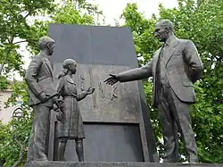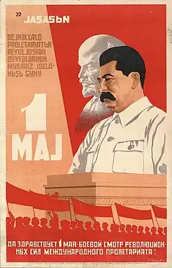 One key element of Soviet propaganda was interaction between Stalin and the children of the Soviet Union. He was often photographed with children of different ethnic backgrounds of the Soviet Union and was often photographed giving gifts to children. In 1935 the phrase, "Thank You, Dear Comrade Stalin, for a Happy Childhood!" started to appear above doorways at nurseries, orphanages, and schools; children also chanted this slogan at festivals.[155] Another key element of Soviet propaganda was imagery of Stalin and Lenin. In many posters, Stalin and Lenin were placed together to show their camaraderie and that their ideals were one. Throughout the 1930s, posters with both images were used as a way to bring the nation and the military together under the policies of the Communist Party during World War II, with the idea of Lenin as the father of the revolutionary ideas and Stalin as the disciple who would fulfill the communist ideals.[150] Stalin was also portrayed in numerous films produced by Mosfilm, which remained a Soviet-led company until the fall of the Soviet Union.
