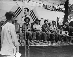 Mujibism initially began as the political ideology of Sheikh Mujibur Rahman ("Mujib", 1920-1975), who led Bangladesh's secession from Pakistan in 1971. From 2008 onwards, Mujib's daughter, Sheikh Hasina, gradually converted Mujibism into a cult of personality around her father.[33][34] After being pushed to the sidelines by two successive military dictators —Ziaur Rehman (who founded the Bangladesh Nationalist Party) and Hussain Muhammad Ershad (who founded the Bangladesh National Party) — the figure of the late Mujib returned to dominate public consciousness from 2008 under the Awami League government led by Hasina. Hasina has been criticised for overemphasising the role of her father and of the Awami League in securing Bangladeshi independence at the cost of sidelining other prominent figures and political parties of the time.[35] Hasina had amended the constitution to make the presence of Mujib's portrait mandatory in every school, government office and diplomatic mission of the country; and made it illegal to criticise Mujib, his ideals or his deeds, especially the one-party BAKSAL regime (1972–75) headed by him, through writing, speech or electronic media. Many events commemorating the birth-centenary of Bangabandhu ('Friend of Bengal' in Bengali, the honorific unofficial title given to Mujib in his lifetime) were launched by the Hasina administration, including an official biopic in collaboration with the Indian government. The Hasina government converted Mujib's residence in the capital city of Dhaka, where he and his family were assassinated by mutinous military personnel in 1975, into a memorial museum. Hasina designated the day of Mujib's assassination as the National Day of Mourning.[36][37] The Hasina government also made the birthdays of Mujib, his wife Sheikh Fazilatunessa, eldest son Sheikh Kamal and youngest son Sheikh Russel as official government holidays, alongside March 7 (on that day in 1971, Mujib declared Bangladesh's secession at a speech in Dhaka). Under Hasina's rule, the country was dotted with numerous statues of Mujib alongside several roads and prominent institutions named after him. Critics state that Hasina utilised the personality cult around her father to justify her own authoritarianism, crackdown on political dissent and democratic backsliding of the country.[38] Following the violent overthrow of Sheikh Hasina in 2024, the cult of personality around Mujib is being systematically dismantled.[39][40]