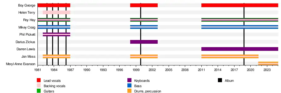 Culture Club is an English new wave band formed in London in 1981. The band comprises Boy George (lead vocals), Roy Hay (guitar and keyboards), and Mikey Craig (bass guitar), and formerly included Jon Moss (drums and percussion). Emerging in the New Romantic scene, they are considered one of the most representative and influential groups of the 1980s.[1]