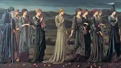 Psyche is arrayed in funeral attire, conveyed by a procession to the peak of a rocky crag, and exposed. Marriage and death are merged into a single rite of passage, a "transition to the unknown".[12] Zephyrus the West Wind bears her up to meet her fated match, and deposits her in a lovely meadow (locus amoenus), where she promptly falls asleep.
