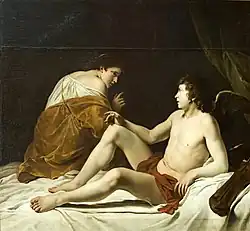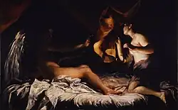 One of the most popular images from the tale was Psyche's discovery of a naked Cupid sleeping, found in ceramics, stained glass, and frescos. Mannerist painters were intensely drawn to the scene.[38] In England, the Cupid and Psyche theme had its "most lustrous period" from 1566 to 1635, beginning with the first English translation by William Adlington. A fresco cycle for Hill Hall, Essex, was modeled indirectly after that of the Villa Farnesina around 1570,[39] and Thomas Heywood's masque Love's Mistress dramatized the tale to celebrate the wedding of Charles I and Henrietta Maria, who later had her withdrawing chamber decorated with a 22-painting Cupid and Psyche cycle by Jacob Jordaens. The cycle took the divinization of Psyche as the centerpiece of the ceiling, and was a vehicle for the Neoplatonism the queen brought with her from France.[40] The Cupid and Psyche produced by Orazio Gentileschi for the royal couple shows a fully robed Psyche whose compelling interest is psychological, while Cupid is mostly nude.[41]