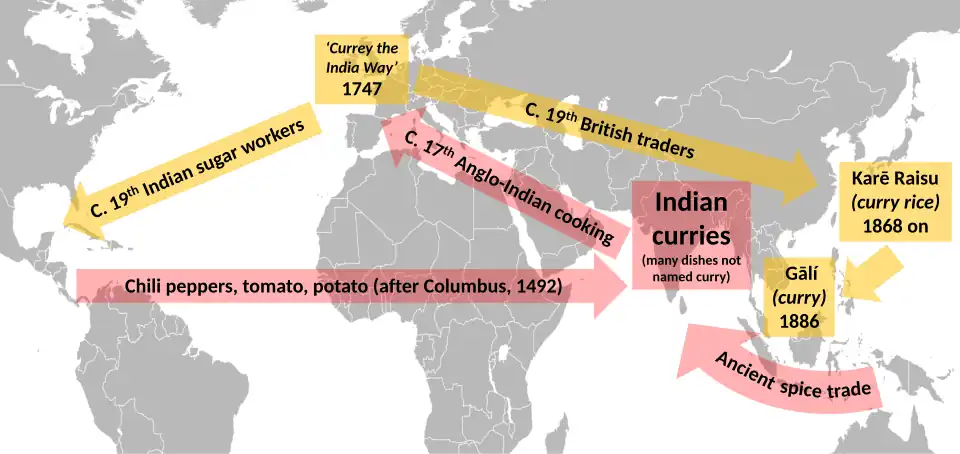 In medieval India, proto-curries were flavoured with mild spices such as asafoetida, cardamom, coriander, cumin, and ginger, with the limited heat of black pepper.[4] A definite step in the creation of modern curry was the arrival in India of spicy hot chili peppers, along with other ingredients such as tomatoes and potatoes, part of the Columbian exchange of plants between the Old World and the New World.[4] The Mughal empire brought new subtly-spiced dishes, especially to the north of India.[4] During the British Raj, Anglo-Indian cuisine developed,[5] leading to Hannah Glasse's 18th century recipe for "currey the India way" in England.[6] Curry was then spread in the 19th century by indentured Indian sugar workers to the Caribbean,[2] and by British traders to Japan.[7] Further exchanges around the world made curry a fully international dish.[2]