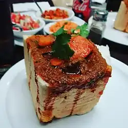 Indian curry sauces are made with spices including black pepper, cardamom, chili peppers, cinnamon, cloves, coriander, cumin, fennel seed, mustard seed, and turmeric.[64] As many as 15 spices may be used for a meat curry.[64] The spices are sometimes fried whole, sometimes roasted, sometimes ground and mixed into a paste.[64][65] The sauces are eaten with steamed rice or idli rice cakes in south India,[64] and breads such as chapatis, roti, and naan in the north.[66] The popular rogan josh, for example, from Kashmiri cuisine, is a wet dish of lamb with a red gravy coloured by Kashmiri chillies and an extract of the red flowers of the cockscomb plant (mawal).[67] Rice and curry is the staple dish of Sri Lanka.[68]