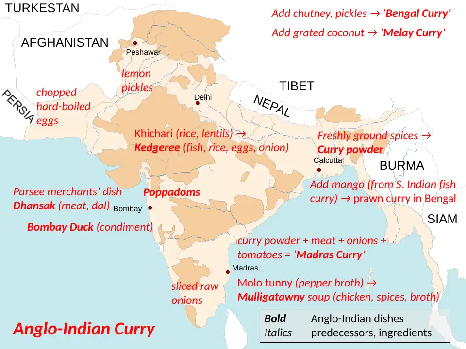 | c. 1850 | Indian regions | Pan-India | Standardised Anglo-Indian cuisine, spice mixes |