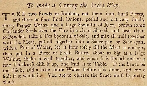 Curry was introduced to English cuisine from Anglo-Indian cooking in the 17th century, as spicy sauces were added to plain boiled and cooked meats.[5] That cuisine was created in the British Raj when British wives or memsahibs instructed Indian cooks on the food they wanted, transforming many dishes in the process.[39] Further, in the late 18th and early 19th centuries, when there were few British women in India, British men often lived with Indian mistresses, acquiring the local customs, language, and food.[40] Curry was first served in coffee houses in Britain from 1809.[41]