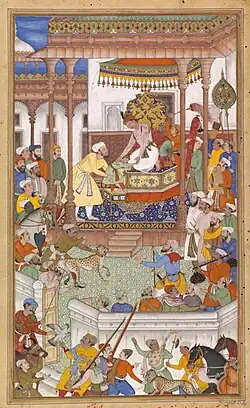 The establishment of the Mughal Empire, in the early 16th century, brought some new and subtly spiced dishes, especially in the north. The Indo-Persian Mughal cuisine of the emperor Akbar, as described in the Ain-i-Akbari, could cook aubergines (eggplants) with asafoetida, cardamom, cloves, coriander, ginger, lime juice, onions, and pepper.[4] The cuisine established dishes like biryani in India, derived from Persian pilau rice and the Persian habit of marinading meat in yoghurt (curd), combined with Indian-style use of spices.[36]