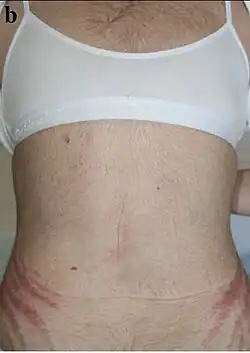 Increased hair and stria in a 30-year-old female patient with iatrogenic Cushing's syndrome[1]