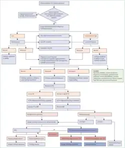 Cushing's syndrome is caused by either excessive cortisol-like medication, such as prednisone, or a tumor that either produces or results in the production of excessive cortisol by the adrenal glands.[14] Cases due to a pituitary adenoma are known as Cushing's disease, which is the second most common cause of Cushing's syndrome after medication.[4] A number of other tumors, often referred to as ectopic due to their placement outside the pituitary, may also cause Cushing's.[4][15] Some of these are associated with inherited disorders such as multiple endocrine neoplasia type 1 and Carney complex.[8] Diagnosis requires a number of steps.[5] The first step is to check the medications a person takes.[5] The second step is to measure levels of cortisol in the urine, saliva or in the blood after taking dexamethasone.[5] If this test is abnormal, the cortisol may be measured late at night.[5] If the cortisol remains high, a blood test for ACTH may be done.[5]