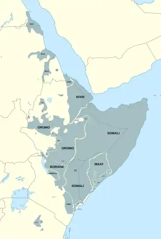 The Cushitic languages with the greatest number of total speakers are Oromo (37 million),[2] Somali (24 million),[3] Beja (3.2 million),[4] Sidamo (3 million),[5] and Afar (2 million).[6]