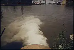 From 1,000 feet [300 m] below Lower Harvard Bridge to Newburgh and South Shore Railroad Bridge, the channel becomes wider and deeper and the level is controlled by Lake Erie. Downstream of the railroad bridge to the harbor, the depth is held constant by dredging, and the width is maintained by piling along both banks. The surface is covered with the brown oily film observed upstream as far as the Southerly Plant effluent. In addition, large quantities of black heavy oil floating in slicks, sometimes several inches thick, are observed frequently. Debris and trash are commonly caught up in these slicks forming an unsightly floating mess. Anaerobic action is common as the dissolved oxygen is seldom above a fraction of a part per million. The discharge of cooling water increases the temperature by 10 to 15 °F [5.6 to 8.3 °C]. The velocity is negligible, and sludge accumulates on the bottom. Animal life does not exist. Only the algae Oscillatoria grows along the piers above the water line. The color changes from gray-brown to rusty brown as the river proceeds downstream. Transparency is less than 0.5 feet [0.15 m] in this reach. This entire reach is grossly polluted.[31]