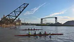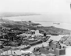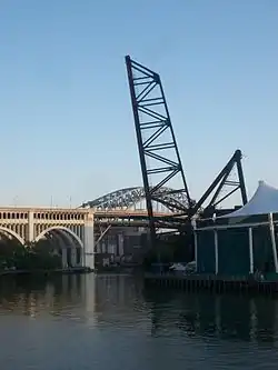 The Cuyahoga River bisects the city of Cleveland. As Cleveland emerged as a major manufacturing center, the river became heavily affected by industrial pollution, so much so that it caught fire at least 14 times. When it did so on June 22, 1969, news coverage of the event helped to spur the American environmental movement.[8][9] For many Americans, the Cuyahoga's burning helped connect urban decay with the environmental crisis at the time in many American cities.[10] Since then, the river has been extensively cleaned up through the efforts of Cleveland's city government and the Ohio Environmental Protection Agency (OEPA).[11] In 2019, the American Rivers conservation association named the Cuyahoga "River of the Year" in honor of "50 years of environmental resurgence".[12][13]