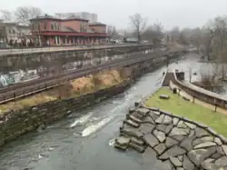 In late 2012, two dams in Cuyahoga Falls, the Sheraton and LeFever Dams, were scheduled for demolition,[67] as the result of an agreement between the city of Cuyahoga Falls, which owns the dams, and the Northeast Ohio Regional Sewer District, which will provide $1 million of funding to remove the dams. On December 12, 2012, the ACOE issued a permit, allowing the demolition to proceed.[68] As part of the project, a water trail was developed.[69] In early June 2013, dam removal began, and ended on August 20, 2013.[70] This brought about a mile of the river back to its natural state, removed 35 feet (11 m) of structures, and exposed an equivalent quantity of whitewater for recreation. In 2019, attempts by the city to address increased erosion as a result of the removal of these and other area dams were publicized.[71]