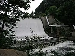 The FirstEnergy Dam was built by the Northern Ohio Traction and Light Co. in 1912 to serve the dual functions of generating hydropower for its local streetcar system and providing cooling-water storage for a coal-burning power plant; however, the hydropower operation was discontinued in 1958, and the coal-burning plant was decommissioned in 1991.[64] Some environmental groups and recreational groups want the dam removed.[65] Others contend that such an effort would be expensive and complicated, for at least two reasons: first, the formerly hollow dam was filled in with concrete in the early 1990s, and second, because of the industrial history of Cuyahoga Falls, the sediment upstream of the dam is expected to contain hazardous chemicals, possibly including heavy metals and PCBs. The Ohio EPA estimated removal of the dam would cost $5–10 million, and removal of the contaminated sediments, a further $60 million.[66] The dam is licensed through 2041.