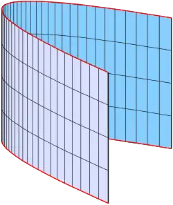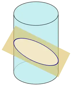 A cylindric section is the intersection of a cylinder's surface with a plane. They are, in general, curves and are special types of plane sections. The cylindric section by a plane that contains two elements of a cylinder is a parallelogram.[5] Such a cylindric section of a right cylinder is a rectangle.[5]