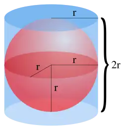 In the treatise by this name, written c. 225 BCE, Archimedes obtained the result of which he was most proud, namely obtaining the formulas for the volume and surface area of a sphere by exploiting the relationship between a sphere and its circumscribed right circular cylinder of the same height and diameter. The sphere has a volume two-thirds that of the circumscribed cylinder and a surface area two-thirds that of the cylinder (including the bases). Since the values for the cylinder were already known, he obtained, for the first time, the corresponding values for the sphere. The volume of a sphere of radius r is 4/3πr3 = 2/3 (2πr3). The surface area of this sphere is 4πr2 = 2/3 (6πr2). A sculpted sphere and cylinder were placed on the tomb of Archimedes at his request.