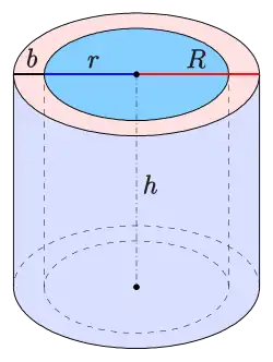 Let the height be h, internal radius r, and external radius R. The volume is given by subtracting the volume of the inner imaginary cylinder (i.e. hollow space) from the volume of the outer cylinder: Thus, the volume of a cylindrical shell equals 2π ×average radius ×height × thickness.[11]