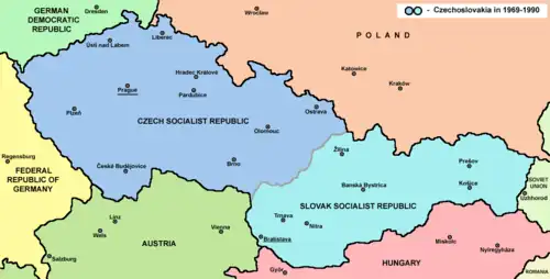 - 1989–1990: Czechoslovakia formally became a federal republic comprising the Czech Socialist Republic and the Slovak Socialist Republic. In late 1989, the communist rule came to an end during the Velvet Revolution followed by the re-establishment of a democratic parliamentary republic.[10]