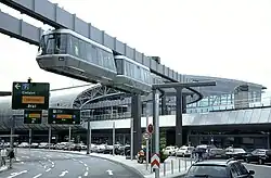 In 2002, the inter-terminal shuttle bus service was replaced by the suspended monorail called the SkyTrain connecting the terminal building with the InterCity train station. The monorail travels the 2.5 kilometres (1.6 mi) between the terminal and station at a maximum speed of 50 kilometres per hour (31 mph). The system was developed by Siemens and is based on the similar H-Bahn operating with two lines on the Dortmund university campus.