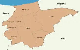 Düzce Province (Turkish: Düzce ili) is a province in northwestern Turkey. The province is on the coastline of the Black Sea and is traversed by the main highway between Istanbul and Ankara. The primary town is Düzce, located in the center of the province. There are ancient Greek ruins in the province. Düzce separated from the Bolu province and became a province in its own right after a devastating earthquake in the city in November 1999. Its area is 2,492 km2,[2] and its population is 405,131 (2022).[1]