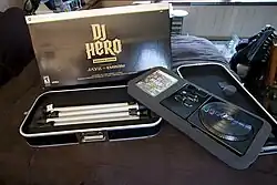 DJ Hero has received positive reviews from the gaming press, who consider the title as a fresh restart of the music genre given the large number of titles based on guitar play.[49][53] The turntable peripheral was considered to be well designed to meet the needs of the game.[53][56] The unit's weight, size, and shape, and ability to cater to both left- and right-handed players was commended.[48][51] Many reviewers noted a need to alter the action of the crossfader, either by having better physical feedback to the player to indicate the center of the knob's track, or by reducing the width of the track to better handle the rapid crossfade maneuvers.[49][51][52] Reviewers also noted that there was a certain weight to the turntable portion of the controller which made scratching imprecise, particularly with the inner blue button where only minimal torque can be applied.[48][52] The learning curve of the game across the various mixes was highly commended by reviewers for helping players to get used to the new controller. When progressing from "Medium" to "Hard" and "Expert" levels and encountering more complex mixes, reviewers thought the game felt transformed, bringing a difficult but more rewarding experience to the player as they begin emulating every part of a real DJ's motions.[50][53] Johnny Minkley of Eurogamer considered that while the learning curve is steep, with the "Easy" difficulty being "less thrilling and engaging" compared to Guitar Hero, the game was "structured fabulously to nudge you gradually closer to the summit" with each successive career set and difficulty mode.[49] Cam Shae of IGN Australia felt that the changes in "Hard" mode over "Medium" were somewhat excessive, introducing both more crossfade effects and button-pressing, and felt these could have been introduced separately in "Hard" and "Expert" modes.[55] Richard Li of 1UP.com noted that the inability to fail a song is both "a bane and a boon"; newer players would not feel frustration at trying to get used to the controller and would be able to quickly unlock all the sets in the game's career mode, but without knowing where they failed, they would not have an idea of where they need to hone their skills to improve their performance at the game.[48] The omission of a practice mode was noted by Daemon Hatfield of IGN, believing it would help in some of the more complex mixes by the DJ celebrities.[53] Reviewers believed that the small faults in DJ Hero can be easily fixed for potential sequels.[57]