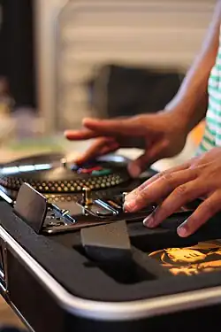 DJ Hero primarily simulates turntablism, a musical style used by disc jockeys to create a new mashup song by incorporating one or more previously recorded songs played on record players along with sound effect generators. The game features score attack gameplay similar to the Guitar Hero games. The controller consists of a wireless deck consisting of a movable turntable that supports 3 "stream" buttons, an effects dial, a crossfader, and a "Euphoria" button; a hidden panel contains additional controller buttons to interact with the gaming console outside of the game.[2] A portion of the controller can be detached and reattached to adapt the unit for left-handed players.[3] Notes travel in an arc across a spinning record on screen, and the player holds down one of the 3 stream buttons to play notes; two buttons reflect the two songs used in that particular mix, and the third represents samples to add to the mix which can be adjusted with the effects dial.[2] The player must also constantly adjust the crossfader to match onscreen symbols, which alters the relative volume of the songs as to bring one song to the forefront of the mix for a short time.[2] Certain tracks are shown on screen as a series of up or down arrow, representing scratching sections, requiring the player to turn the turntable in the direction of the arrows while holding down the button to score points, mimicking the scratching of the record needle on vinyl albums.[2] "Euphoria" is equivalent to Guitar Hero's Star Power, collected by successfully completing specific phrases in the song mix, called Perfect Regions, and can be released by pressing the Euphoria button, doubling the player's current multiplier as well as automatic crossfading when active.[2] There is also a "Rewind" meter that builds through consistent successful playing, and once full, allows the player to rewind the song to fix errors in their performance.[2][3] The player must continue to perform well or their performance meter will drop and the music track will cut out. Failing the song is not possible, unlike in Guitar Hero games.[2]