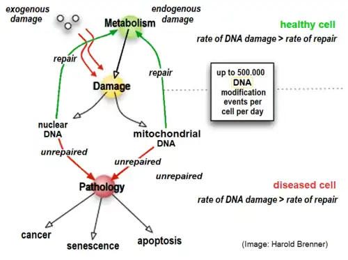 Molecular lesions can cause structural damage to the DNA molecule, and can alter or eliminate the cell's ability for transcription and gene expression. Other lesions may induce potentially harmful mutations in the cell's genome, which affect the survival of its daughter cells following mitosis. Consequently, DNA repair as part of the DNA damage response (DDR) is constantly active. When normal repair processes fail, including apoptosis, irreparable DNA damage may occur, that may be a risk factor for cancer.[3]