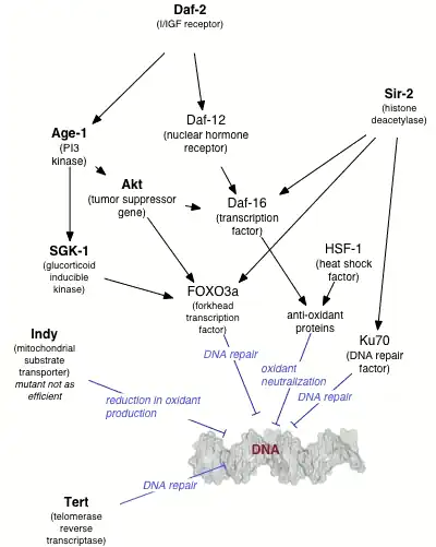 78. ^ Tissenbaum HA, Guarente L (March 2001). "Increased dosage of a sir-2 gene extends lifespan in Caenorhabditis elegans". Nature. 410 (6825): 227–30. Bibcode:2001Natur.410..227T. doi:10.1038/35065638. PMID 11242085. S2CID 4356885.