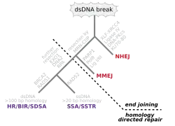 2. MMEJ starts with short-range end resection by MRE11 nuclease on either side of a double-strand break to reveal microhomology regions.[41] In further steps,[42] Poly (ADP-ribose) polymerase 1 (PARP1) is required and may be an early step in MMEJ. There is pairing of microhomology regions followed by recruitment of flap structure-specific endonuclease 1 (FEN1) to remove overhanging flaps. This is followed by recruitment of XRCC1–LIG3 to the site for ligating the DNA ends, leading to an intact DNA. MMEJ is always accompanied by a deletion, so that MMEJ is a mutagenic pathway for DNA repair.[43]