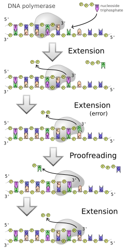 - ^ The energetics of this process may also help explain the directionality of synthesis—if DNA were synthesized in the 3′ to 5′ direction, the energy for the process would come from the 5′ end of the growing strand, rather than from free nucleotides. The problem is that if the high-energy triphosphates were on the growing strand and not on the free nucleotides, proofreading by removing a mismatched terminal nucleotide would be problematic: once a nucleotide is added, the triphosphate is lost and a single phosphate remains on the backbone between the new nucleotide and the rest of the strand. If the added nucleotide were mismatched, removal would result in a DNA strand terminated by a monophosphate at the end of the "growing strand" rather than a high-energy triphosphate. The strand would consequently be stuck and would not be able to grow anymore. In actuality, the high-energy triphosphates hydrolyzed at each step originate from free nucleotides, not the polymerized strand, so this issue does not exist.