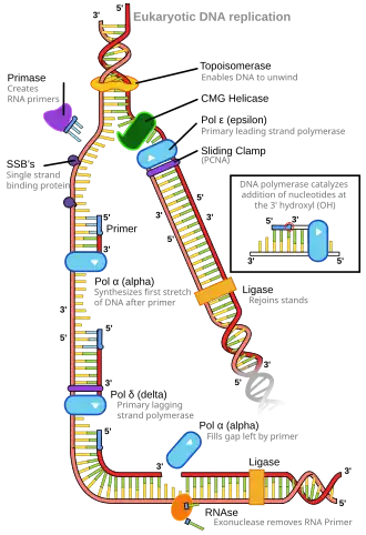 In eukaryotes, the low-processivity enzyme, Pol α, helps to initiate replication because it forms a complex with primase.[36] In eukaryotes, leading strand synthesis is thought to be conducted by Pol ε; however, this view has recently been challenged, suggesting a role for Pol δ.[37] Primer removal is completed Pol δ[38] while repair of DNA during replication is completed by Pol ε.