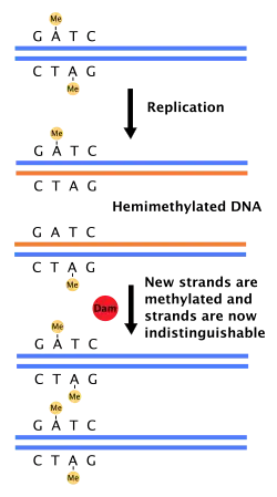 - ^ Slater S, Wold S, Lu M, Boye E, Skarstad K, Kleckner N (September 1995). "E. coli SeqA protein binds oriC in two different methyl-modulated reactions appropriate to its roles in DNA replication initiation and origin sequestration". Cell. 82 (6): 927–936. doi:10.1016/0092-8674(95)90272-4. PMID 7553853. S2CID 14652024.