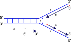 a: template, b: leading strand, c: lagging strand, d: replication fork, e: primer, f: Okazaki fragments