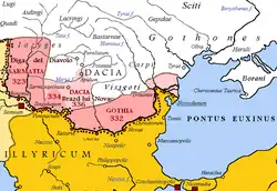 In 328 the emperor Constantine the Great inaugurated the Constantine's Bridge (Danube) at Sucidava, (today Corabia in Romania)[57] in hopes of reconquering Dacia, a province that had been abandoned under Aurelian. In the late winter of 332, Constantine campaigned with the Sarmatians against the Goths. The weather and lack of food cost the Goths dearly: reportedly, nearly one hundred thousand died before they submitted to Rome. In celebration of this victory Constantine took the title Gothicus Maximus and claimed the subjugated territory as the new province of Gothia.[58] In 334, after Sarmatian commoners had overthrown their leaders, Constantine led a campaign against the tribe. He won a victory in the war and extended his control over the region, as remains of camps and fortifications in the region indicate.[59] Constantine resettled some Sarmatian exiles as farmers in Illyrian and Roman districts, and conscripted the rest into the army. The new frontier in Dacia was along of a huge earthen wall, almost 700 km long, named today the Brazda lui Novac line, supported by Castra of Hinova, Rusidava and Castra of Pietroasele.[57] The limes passed to the north of Castra of Tirighina-Bărboși and ended at Sasyk Lagoon near the Dniester River.[60] Constantine took the title Dacicus maximus in 336.[61]