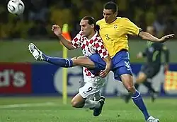 He made his debut for Croatia in a March 2003 European Championship qualification match against Belgium and went on to earn a total of 32 caps, scoring 9 goals.[17][18] Pršo was part of the Croatian team at UEFA Euro 2004 where he played in three games. Pršo is remembered in this tournament for the one goal he scored against France in Leiria on 17 June 2004.[19] After scoring four goals during qualifying, he was selected to represent his country at the 2006 FIFA World Cup. But he scored no goals during the tournament itself (where the team, as in 2004, was eliminated after the first round).