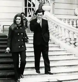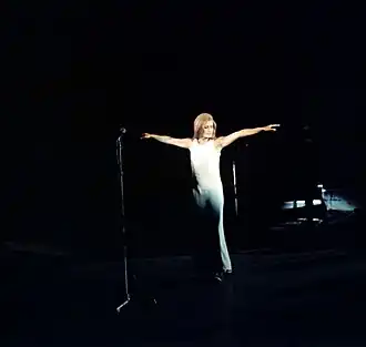 After competing for four months in Canzonissima, then the most popular TV show in Italy, in January 1968 Dalida won with "Dan dan dan" that reached number two in the country.[91] Dalida also came back to film for her first main role in five years, in Italian romantic drama Io ti amo, acting as stewardess Judy alongside Alberto Lupo. The movie was a minor success, but as it was filmed in colour and several of her new songs appeared in, it provided critically acclaimed music video for her latest Italian chart topper and gold certified "L'ultimo valzer".[92] After the filming, Dalida embarked upon a two-year-long world tour that extended until early 1970. With more than 300 live performances it was Dalida's longest tour up to that moment and, as a part of it, in summer 1968 she participated in a popular Italian summer festival Cantagiro and won the main prize.[93] In 1969, during the third leg that started on 9 January in Milan, for the first time in career Dalida performed in Yugoslavia and in Africa. After Gabon in December and in Tahiti in January 1970, the tour ended in Iran in February.[47]