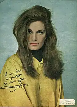 During 1961, Dalida issued a set of new Italian songs on the Canta in italiano EP, and also scored several top ten hits internationally such as "Nuits d'Espagne" and "Tu ne sais pas". In April "Pépé" became a number one hit both in Austria and Germany, while "24 mille baisers" charted separately in Austria and France.[63] She also issued two albums Dalida internationale and Loin de moi. During the spring in Italy, Dalida signed with film director Giorgio Simonelli and revived her film career with the first film in which she plays the main role. Originally titled Che femmina... e che dollari!, it was revoiced and retitled for a French audience as Parlez-moi d'amour, after one of the soundtrack songs. The movie also features several other recordings by Dalida, including the posthumously released "Ho trovato la felicità". In contrast to her other previous movies, Che femmina... e che dollari! was not a commercial failure, with the moderate gross income eventually surpassing the low budget.[64] Rihoit wrote: "sealing her appearance of the early 60's, since it is also her first color film, all the power and acting potential that Dalida carries in herself and transmits to the screen is clearly visible".[37]