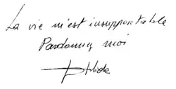 With "Mama" in January 1967, Dalida had success in France and Turkey, and was back at the top of the Italian charts later the same year.[85] "Ciao amore, ciao", written and composed by Tenco, was released alongside as it had been chosen as their competing song for the Sanremo Music Festival.[86] The festival premiered on 26 January and they both separately sang their own version. Under the influence of stage fright and alcohol, Tenco delivered a poor performance, while Dalida concluded the evening with an ovation, but eventually they were eliminated in the first round. The following night ended tragically when Tenco was found dead by Dalida in their hotel room. It was reported that a suicide note explained that he had taken his life owing to the elimination from the contest, as a protest against the corruption and bribery of the jury, but major suspicion of the involvement of the mafia emerged.[87][37] Although the public did not know anything of their relationship, the event greatly affected Dalida and her next concert in Boulogne-Billancourt scheduled for 31 January was cancelled. The following week on 7 February, she appeared on the TV show Palmarès des chansons, dedicating her rendition of "Parlez-moi de lui" to Tenco. Wearing the same dress that she had been wearing when she found his body, the performance was highly sentimental but indicated nothing of an emerging depression. On 26 February, Dalida attempted to take her life, ended up in hospital and spent five days in a coma.[31] The truth was revealed about her involvement with Tenco, leaving her worldwide public stunned. Her career was put on hiatus for three months.[42]