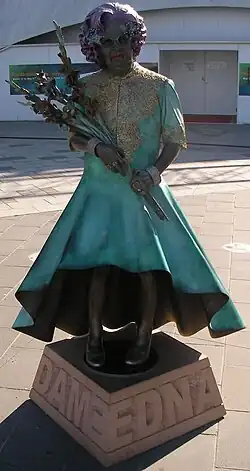 The character celebrated her 50th "birthday" in 2005. She appeared in the 2005 Myer Christmas advert. To mark the occasion, in 2006, Australia Post featured Edna on a postage stamp[38] and the Lord Mayor of Melbourne presented Edna with the key to the city.[39] She toured Australia with the stageshow "Barry Humphries Back With a Vengeance" and appeared on camera "together" with Humphries for the first time in an interview by Ray Martin for Australia's 60 Minutes.[40] She also appeared on screen at the Closing Ceremony of the 2006 Commonwealth Games in Melbourne while 1000 "Commonwealth Dames" danced around the arena wearing purple wigs, garish costumes and gladioli, singing along to her song, "We've Made The Most of Melbourne" : "It's not as small as Adelaide, Compared to Canberra, it's bliss, And if you've been to Melbourne, You can give Sydney a miss."[41]