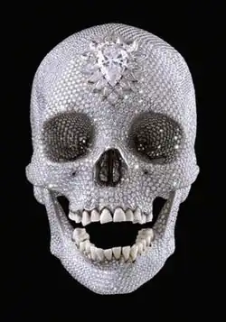 In June 2007, Beyond Belief, an exhibition of Hirst's new work, opened at the White Cube gallery in London. The centre-piece, a Memento Mori titled For the Love of God, was a human skull recreated in platinum and adorned with 8,601 diamonds weighing a total of 1,106.18 carats.[65] Approximately £15,000,000 worth of diamonds were used. It was modelled on an 18th-century skull, but the only surviving human part of the original is the teeth. The asking price for For the Love of God was £50,000,000 ($100 million or 75 million euros). It didn't sell outright,[66] and on 30 August 2008 was sold to a consortium that included Hirst himself and his gallery White Cube.[66]