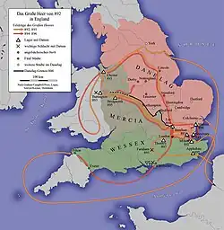From around 800, there had been waves of Norse raids on the coastlines of Britain and Ireland. In 865, instead of raiding, the Danes landed a large army in East Anglia, with the intention of conquering the four Anglo-Saxon kingdoms of England. The armies of various Danish leaders had collaborated to make one combined force under a leadership that included Halfdan Ragnarsson and Ivar the Boneless, the sons of the legendary Viking leader Ragnar Lodbrok.[10] The combined army was described in the annals as the Great Heathen Army.[11] In 867 they captured Northumbria and its capital, York ("Jórvík"), defeating both the recently deposed King Osberht of Northumbria and the usurper Ælla of Northumbria. The Danes then placed an Englishman, Ecgberht I of Northumbria, on the throne of Northumbria as a puppet ruler.[12]
