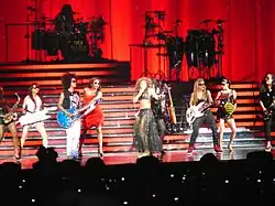 In April 2003, Columbia Records was choosing the lead single from Dangerously in Love between two songs. Sent to clubs, the song that would receive better reception would be selected as the lead single.[39] Finally, "Crazy in Love" was released as the lead single on May 14, 2003. It was lauded by critics who described it as "deliriously catchy".[43] The single topped the US Billboard Hot 100, based on heavy rotation alone.[44] The same week the song reached number one, Dangerously in Love topped the Billboard 200 as well. The substantial airplay and later retail sales of "Crazy in Love" facilitated it to dominate the chart,[45] subsequently spending eight straight weeks atop the Billboard Hot 100,[46] making it Beyoncé's first number-one single in her solo career. According to Nielsen SoundScan, "Crazy in Love" was the most downloaded song in the United States for four consecutive weeks in July 2003.[46] The digital single was certified sextuple platinum by the Recording Industry Association of America (RIAA).[47] The song also became a success internationally, reaching the top of the charts in Croatia, Ireland and the United Kingdom.[48][49] At the 46th Annual Grammy Awards (2004), the song won Best R&B Song and Best Rap/Sung Collaboration.[50][51] Its Jake Nava-directed accompanying music video "celebrates the evolution of a woman. It is about a girl who is at the point of a relationship. She realizes that she is in love, she is doing stuff she would not normally do but she does not care. It does not matter she is just crazy in love."[52] Critically acclaimed, the video won Best Female Video, Best R&B Video and Best Choreography in a Video at the 2003 MTV Video Music Awards.[53]