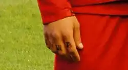 Outside of football, Agger is a qualified tattoo artist.[59] He has numerous tattoos including a Viking on his upper right arm, a large drawing of Vikings and a graveyard that spans his whole back,[60] which includes his birth date and the Latin motto "Mors certa, hora incerta" ("death is certain, its hour is uncertain"),[61][62] forming a memento mori. He also features an intricate band around his left elbow which includes the phrase "Succes er at leve som man selv vil" ("Success is to live as you wish" in Danish). In August 2012, during a period of intense speculation regarding his future at the club, Agger had the letters "YNWA" tattooed on the fingers of his right hand, referencing the anthem of Liverpool F.C., "You'll Never Walk Alone".[63]