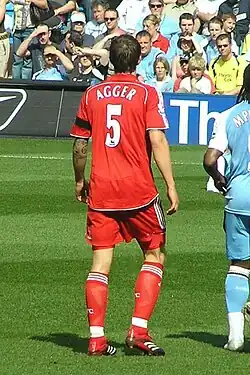 Daniel Munthe Agger (Danish: [ˈtɛˀniəl ˈɑkɐ]; born 12 December 1984) is a Danish professional football coach and former player who is the assistant manager of the Danish national football team. As a player, he played as a centre-back for Brøndby and Liverpool and captained the Denmark national team. Agger was described as "a fine reader of the game, comfortable on the ball and blessed with a ferocious shot".[4] He was the 2007 and 2012 Danish Football Player of the Year.