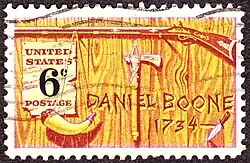 Boone spent his early years on the Pennsylvania frontier, often interacting with Native Americans.[10] Boone learned to hunt from local settlers and Native Americans; by the age of fifteen, he had a reputation as one of the region's best hunters.[11] Many stories about Boone emphasize his hunting skills. In one tale, the young Boone was hunting in the woods with some other boys when the howl of a panther scattered all but Boone. He calmly cocked his rifle and shot the panther through the heart just as it leaped at him. The story may be a folktale, one of many that became part of Boone's popular image.[11]