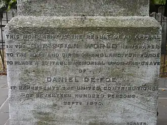 Defoe died on 24 April 1731, in Ropemakers Alley, not far from where he was born in Cripplegate, probably while in hiding from his creditors.[59] He was often in debtors' prison.[60] The cause of his death was labelled as lethargy, but he probably experienced a stroke.[2] He was interred in Bunhill Fields (today Bunhill Fields Burial and Gardens), just outside the medieval boundaries of the City of London, in what is now the Borough of Islington, where a monument was erected to his memory in 1870.[61] A street in the Bronx, New York, is named in his honour (De Foe Place).[62]
