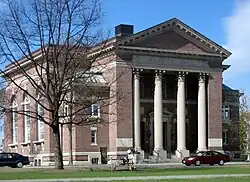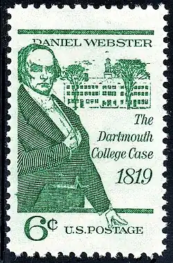 In Dartmouth College v. Woodward, Webster was retained by the Federalist trustees of his alma mater, Dartmouth College, in their case against the newly elected New Hampshire Democratic-Republican state legislature. The legislature had passed new laws converting Dartmouth into a state institution, by changing the size of the college's trustee body and adding a further board of overseers, which they put into the hands of the state senate.[46] He argued that the Constitution's Contract Clause prohibited the legislature from altering the college's board of trustees. The Marshall Court, continuing with its history of limiting states' rights and reaffirming the supremacy of the constitutional protection of contract, ruled in favor of Dartmouth. The ruling set the important precedent that corporations did not, as many then held, have to justify their privileges by acting in the public interest, but were independent of the states.[47]